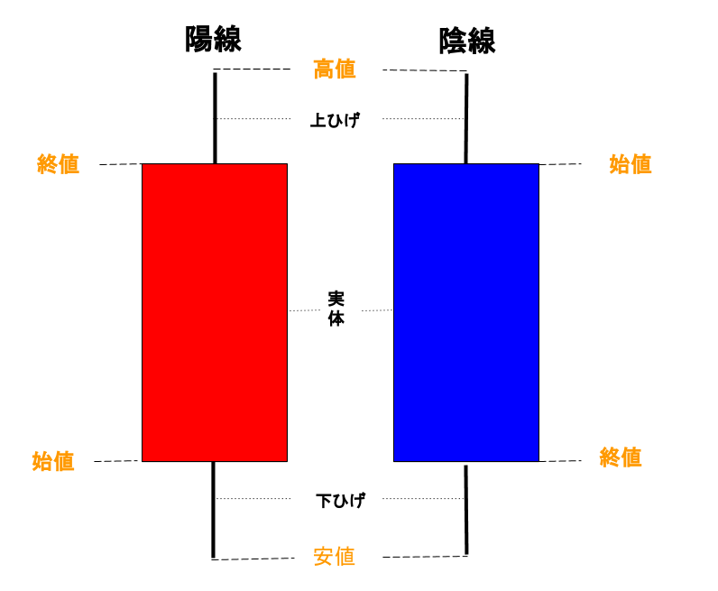 始値より終値が高いものが陽線、始値より終値が安いものが陰線と呼ばれます。